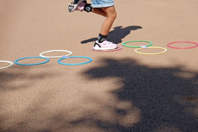 走るときに足が十分に上がらず、つまずきやすい傾向もあります。これは、バランス感覚や体幹の筋力が弱いことに加え、空間認知が未発達な場合があるためです。地面との距離感がつかみにくく、足が引っかかってしまうことも。改善には、段差を上る・ジャンプする・ケンケンするなどの「下肢を意識する遊び」が効果的です。足の動きを意識させることで、自然にスムーズな走り方につながります。